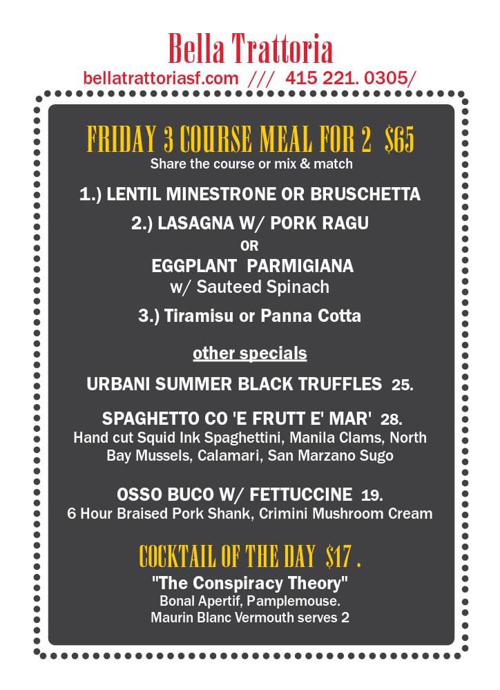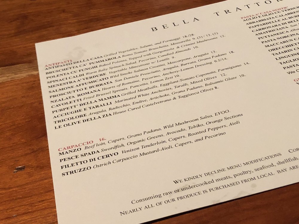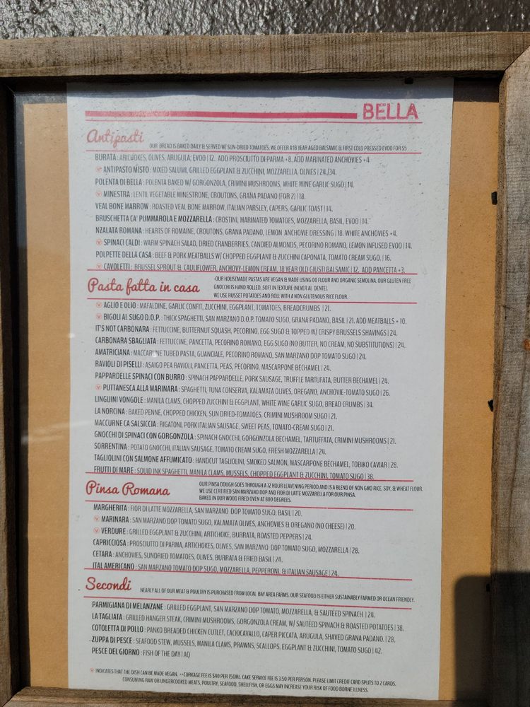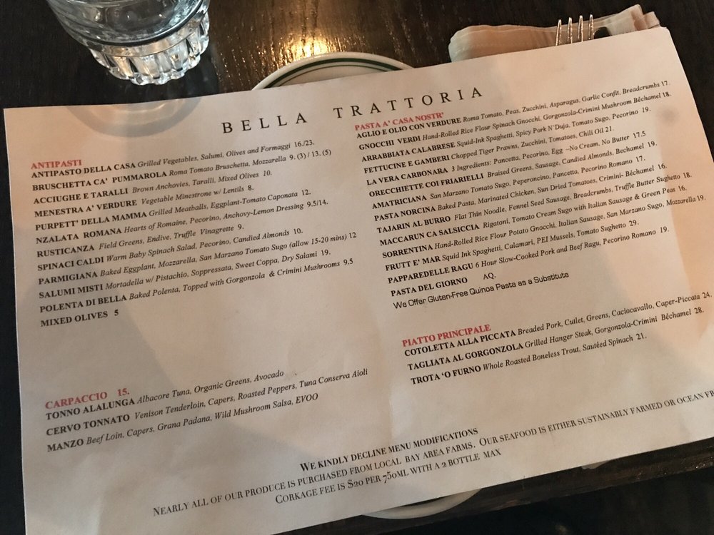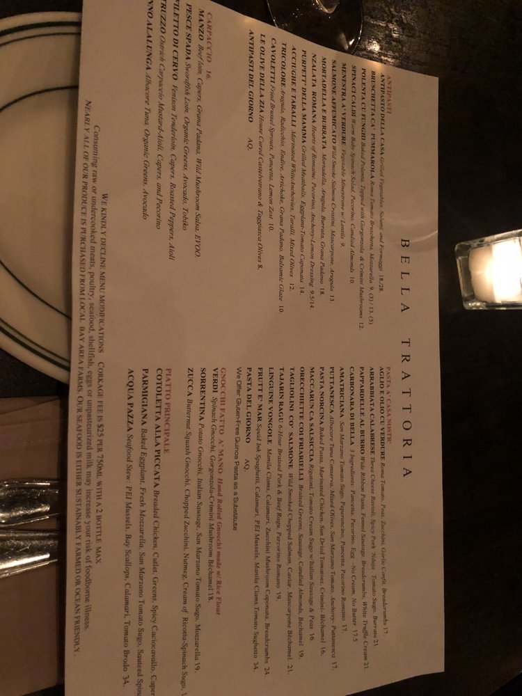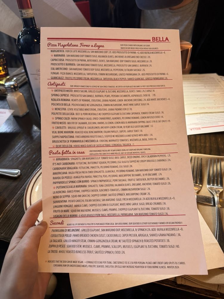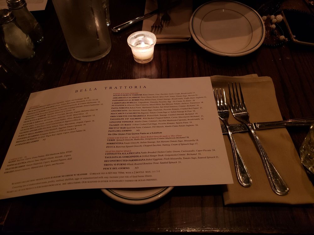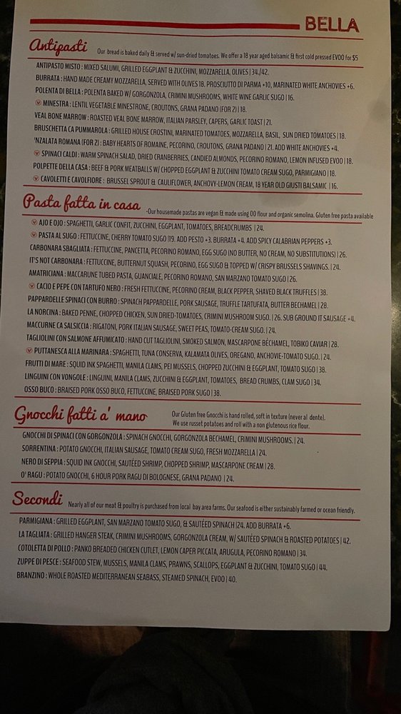 Introducing the menu at Bella Trattoria, a gem located in San Francisco, where every detail caters to a delightful dining experience. This Italian restaurant offers a variety of dishes that cater to different dietary needs like pescatarian and vegan options. The intimate and romantic ambiance sets the perfect backdrop for a memorable meal. From Fruitti di Mare to Lobster Ravioli, each dish is crafted with care and attention to flavor. The accommodating staff ensures a pleasant dining experience, making adjustments for food allergies if needed. Whether you're a gluten-free eater or looking for a cozy spot to enjoy authentic Italian cuisine, Bella Trattoria stands out as a top choice in San Francisco. Don't miss out on their mouthwatering Bruschetta and Cipriani Bellini, truly a taste of Italy in the heart of California.